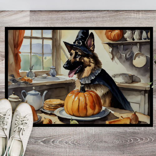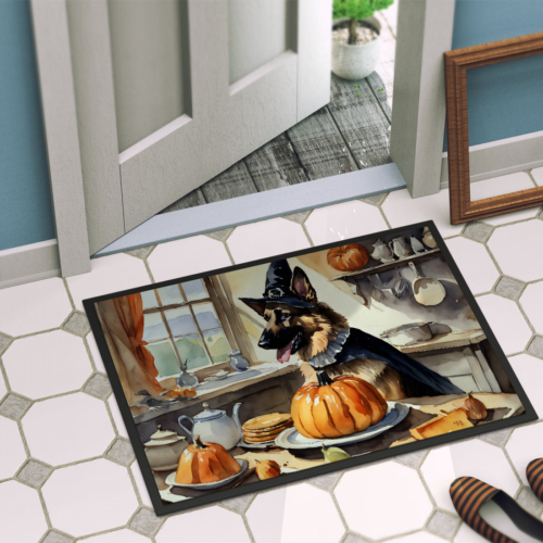 Doormat featuring breed specific German Shepherd artwork. Celebrate Halloween with this Halloween Doormat. Welcome your guests in style with our Artwork Door Mat, designed to withstand almost any weather condition. This mat, measuring approximately 18 by 27 inches, is held together by durable black binding tape. Its top layer, composed of polyester felt, is dyed with the eye-catching image you see on the mat. A few layers below provide the mat with stability, while its rubber bottom is stamped to help prevent slipping and ensures safety. Our mat works wonderfully as both an indoor or outdoor door mat. For cleaning, simply hose it off with water or use a power washer – no need for any cleaner that produces suds. Avoid scrubbing with a brush, instead, opt for the vacuum on floor setting. Designed manufactured and printed in the USA, this mat is a perfect addition to your porch, outdoor kitchen, entryway, or any indoor space. Its unique design makes it a charming decorative rug that greets your guests and adds a stylish touch to your home decor.
