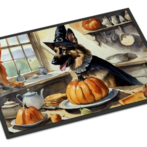 Doormat featuring breed specific German Shepherd artwork. Celebrate Halloween with this Halloween Doormat. Welcome your guests in style with our Artwork Door Mat, designed to withstand almost any weather condition. This mat, measuring approximately 18 by 27 inches, is held together by durable black binding tape. Its top layer, composed of polyester felt, is dyed with the eye-catching image you see on the mat. A few layers below provide the mat with stability, while its rubber bottom is stamped to help prevent slipping and ensures safety. Our mat works wonderfully as both an indoor or outdoor door mat. For cleaning, simply hose it off with water or use a power washer – no need for any cleaner that produces suds. Avoid scrubbing with a brush, instead, opt for the vacuum on floor setting. Designed manufactured and printed in the USA, this mat is a perfect addition to your porch, outdoor kitchen, entryway, or any indoor space. Its unique design makes it a charming decorative rug that greets your guests and adds a stylish touch to your home decor.