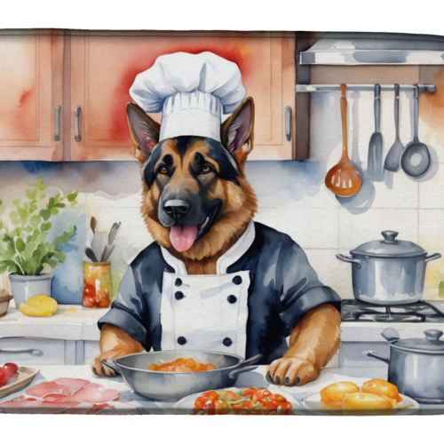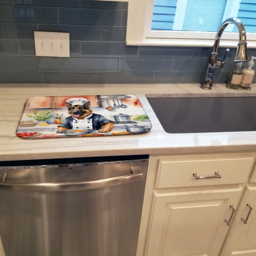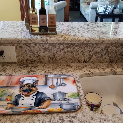 Dish Drying Mat featuring breed specific German Shepherd artwork. Say goodbye to messy countertops and soggy dish towels with our innovative dish drying mat. Our high-quality dish drying pad is designed to keep your countertops dry while offering a stylish and efficient solution. Whether you’re air drying dishes, glasses, stemware, silverware, pots, pans, bottles, or even fruits and vegetables, our dish mat is the perfect choice. The 14 inches x 22 inches size fits most counters and dish drying racks, and the non-slip design ensures stability. Made with water-absorbent polyester and a polyurethane foam insert, our dish drying mat is not only functional but also durable. It’s machine washable and printed in the USA for long-lasting use. The beautiful artwork adds flair to your kitchen decor, making it a perfect housewarming gift or present for any occasion. Upgrade your kitchen experience with our absorbent and versatile dish drying mat.