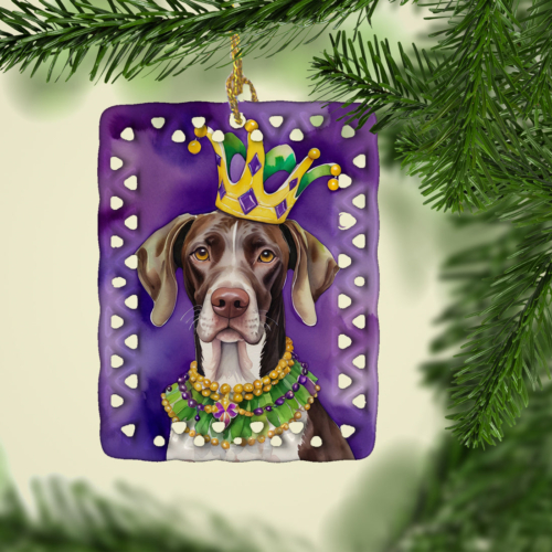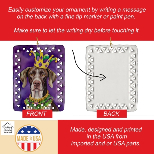 Porcelain Ornament featuring breed specific German Shorthaired Pointer artwork. Celebrate Mardi Gras with this Mardi Gras Ornament. Add a unique, personal touch to your holiday decor with our Rectangular Lattice Porcelain Ornament. Perfect for creating cherished memories, this high-quality ornament shines under festive lights, reflecting warmth and joy throughout your Christmas tree. Crafted with a glossy finish, it showcases vibrant, full-color artwork contributed by our talented artists, ensuring your tree is adorned with a burst of color and holiday spirit. What sets this Porcelain Ornament apart is its customizable white back. Use a paint pen or permanent marker to write a heartfelt message, commemorate a special year, or mark an unforgettable date, turning this ornament into a keepsake that will be treasured for years to come. For best results, allow any personalization to dry thoroughly before handling. Each ornament comes complete with a delicate gold cord, making it easy to hang and display. Proudly made in the USA, this ornament measures 3.375 x 2.625 inches and is a thoughtful gift for pet sitters, teachers, family members, or anyone who would appreciate a little extra holiday magic. Bring style, charm, and a touch of personal meaning to your Christmas tree with this beautifully designed ornament..