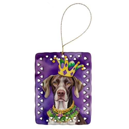 Porcelain Ornament featuring breed specific German Shorthaired Pointer artwork. Celebrate Mardi Gras with this Mardi Gras Ornament. Add a unique, personal touch to your holiday decor with our Rectangular Lattice Porcelain Ornament. Perfect for creating cherished memories, this high-quality ornament shines under festive lights, reflecting warmth and joy throughout your Christmas tree. Crafted with a glossy finish, it showcases vibrant, full-color artwork contributed by our talented artists, ensuring your tree is adorned with a burst of color and holiday spirit. What sets this Porcelain Ornament apart is its customizable white back. Use a paint pen or permanent marker to write a heartfelt message, commemorate a special year, or mark an unforgettable date, turning this ornament into a keepsake that will be treasured for years to come. For best results, allow any personalization to dry thoroughly before handling. Each ornament comes complete with a delicate gold cord, making it easy to hang and display. Proudly made in the USA, this ornament measures 3.375 x 2.625 inches and is a thoughtful gift for pet sitters, teachers, family members, or anyone who would appreciate a little extra holiday magic. Bring style, charm, and a touch of personal meaning to your Christmas tree with this beautifully designed ornament..