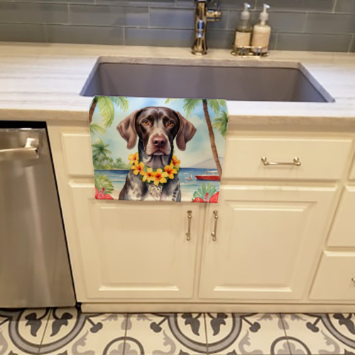 Kitchen Towel featuring breed specific German Shorthaired Pointer artwork. Experience the perfect blend of aesthetic appeal and functional excellence with our Plush Velour Kitchen Towels. These are not your ordinary decorative kitchen towels that gather dust. Instead, they are designed to be as practical as they are stylish. The front layer of our towel is constructed from a minky plush polyester, known for its durability and color retention. Unlike conventional kitchen towels, the artwork on our towels is dyed directly into the fabric, ensuring vibrant colors that last. Polish your glassware to a brilliant sparkle using the plush front side of the towel. Flip to the back, crafted from 100% cotton terry loop, to exploit its exceptional absorbency for drying dishes or wiping down counters. Our kitchen towels redefine the concept of functional art, offering lasting quality that maintains the towel’s shape over time. Measuring 15 inches by 25 inches and weighing 2.3 lbs per dozen, these towels deliver an overwhelming sensory experience with their soft, plush, and smooth texture. The edges are meticulously finished with binding, enhancing their durability and visual appeal. For your convenience, these towels are machine washable and can be dried on low heat. After the first wash, the top fabric becomes even softer and fluffier, eliminating the need for ironing. Treat your kitchen to the luxury and functionality it deserves with our plush velour kitchen towels.