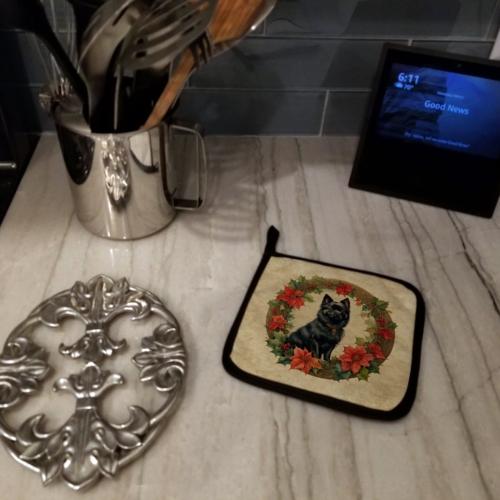 Pair of Pot Holders featuring breed specific German Spitz artwork. Celebrate Christmas with this Christmas Pair of Pot Holders. A Pair of Pot Holders to match your kitchen decor. Made in the USA these are thick and functional. Full color artwork decorates the front polyester fabric of the hot pad and accented by a black trim. Use these at as a trivet for your Thanksgiving or Christmas tablescape. Filled with insulated fabric and quilted for durability. These colorful pot holders will make a great gift for your favorite home cook or executive chef. Each pot holder measures approximately 7 1/2 inches by 7 1/2 inches. A hanging tab is included.