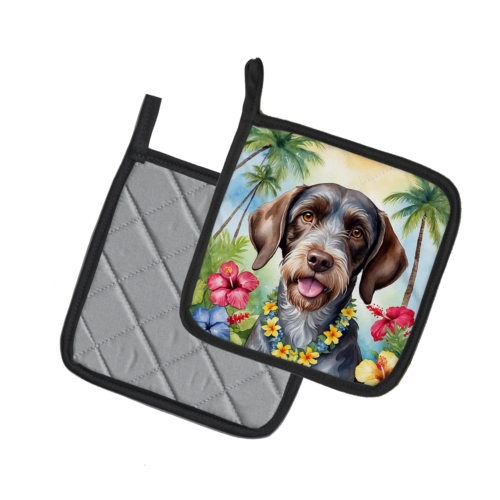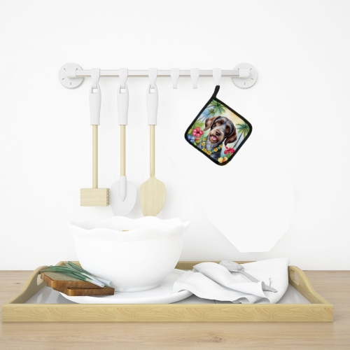 Pair of Pot Holders featuring breed specific German Wirehaired Pointer artwork. A Pair of Pot Holders to match your kitchen decor. Made in the USA these are thick and functional. Full color artwork decorates the front polyester fabric of the hot pad and accented by a black trim. Use these at as a trivet for your Thanksgiving or Christmas tablescape. Filled with insulated fabric and quilted for durability. These colorful pot holders will make a great gift for your favorite home cook or executive chef. Each pot holder measures approximately 7 1/2 inches by 7 1/2 inches. A hanging tab is included.