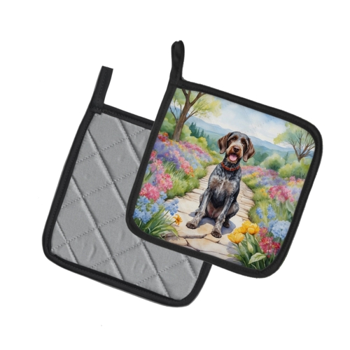 Pair of Pot Holders featuring breed specific German Wirehaired Pointer artwork. A Pair of Pot Holders to match your kitchen decor. Made in the USA these are thick and functional. Full color artwork decorates the front polyester fabric of the hot pad and accented by a black trim. Use these at as a trivet for your Thanksgiving or Christmas tablescape. Filled with insulated fabric and quilted for durability. These colorful pot holders will make a great gift for your favorite home cook or executive chef. Each pot holder measures approximately 7 1/2 inches by 7 1/2 inches. A hanging tab is included.