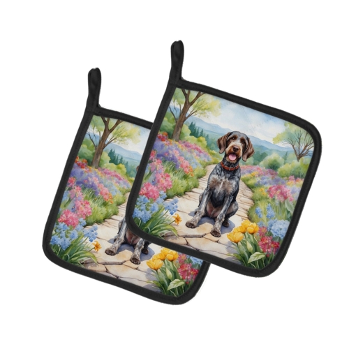 Pair of Pot Holders featuring breed specific German Wirehaired Pointer artwork. A Pair of Pot Holders to match your kitchen decor. Made in the USA these are thick and functional. Full color artwork decorates the front polyester fabric of the hot pad and accented by a black trim. Use these at as a trivet for your Thanksgiving or Christmas tablescape. Filled with insulated fabric and quilted for durability. These colorful pot holders will make a great gift for your favorite home cook or executive chef. Each pot holder measures approximately 7 1/2 inches by 7 1/2 inches. A hanging tab is included.
