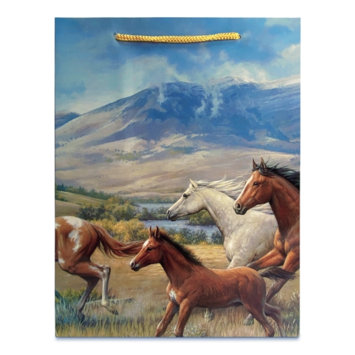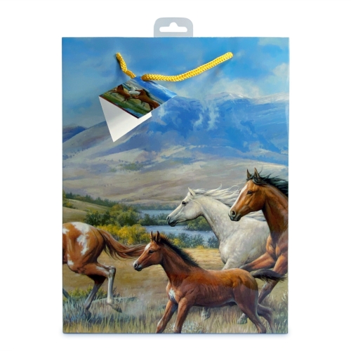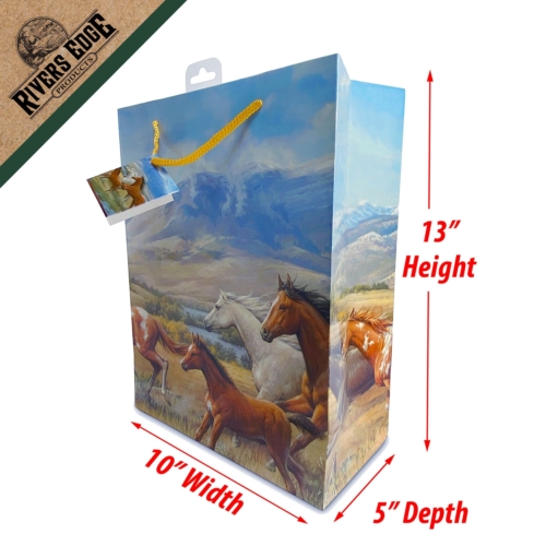 The River’s Edge Products medium horses running free gift bag features outstanding licensed artwork that showcase beautiful horses running free across the land. The bag also features nylon handles, an attached card, and a removable hang tab for pegboard hanging. These gift bags measure 13-inches by 10-inches by 5-inches. Perfectly compliment any gift for an outdoor enthusiast with this gift bag.