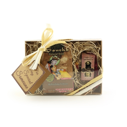 This gift set includes two high-quality body care products from the unique line of Prabhuji’s Gifts. ‘Saucha’ – Natural Soap ‘Refreshing Vetiver’, and Attar oil ‘Tilak’. They are presented in a natural paper box with a clear lid. The items rest on wood wool and are sprinkled with dried rose-buds. The box is tied with colorful paper ribbon, with an attached greeting note that says ‘For a very special someone’. The folded gift card is blank inside, so you can write a personal note. It is a heart-warming gift for friends, family, or co-workers. Soap Bar Saucha – Natural Refreshing Vetiver – 3.5 oz (100g) This 100% natural coconut oil soap is designed with the intention to create a wholesome experience of cleanliness on all levels. High quality ingredients have been carefully selected to ensure a pleasing scent, rich skin nourishment, a positive energetic effect, mental tranquility, and spiritual elevation. Coconut oil is known for its nourishing and beautifying effects upon skin. The combination of uplifting Vetiver oil, warming cinnamon oil, stimulating Eucalyptus oil, invigorating tea tree oil with the touch of regenerating rosemary creates a revitalizing and enlivening experience. Attar Oil Tilak for Love – 3ml This Certified Vegan oil contains a blend of essential oils created for both men and women, and has been especially designed for its innate quality to attract positive vibrations of love. Ancient attar formulas were designed by Sufi spiritual masters to awaken spirituality and heighten mysticism. Aroma: Juicy orange and Concord grape are laced with sweet saffron and rosewood; all supported by cozy vanilla and almond. Essential Oils: Palmarosa oil, Rosewood oil, Orange oil, Gurjum Balsam oil, Cedarwood oil, Geranium oil, Bergamot oil, Patchouli oil. How to use: Apply just a small amount of this highly concentrated oil to your wrist, neck, or other pulse points. The aroma will last for several hours and different fragrance notes will unfold over time Specs SKU: 903-75UPC: 8-09581-90375-1Contains: 1 gift pack LXWXH: 5.5”X4”X1.5” Weight: 6 oz (170 g) Packed and assembled in USA Return Policy: This product is fully refundable.