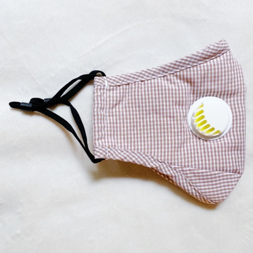 Washable gingham face mask with filter slots, dimensional design and sewing, breathing valve, and nose clip. Adjustable ear loops. Not for medial use or protects from toxic gases. Made in China