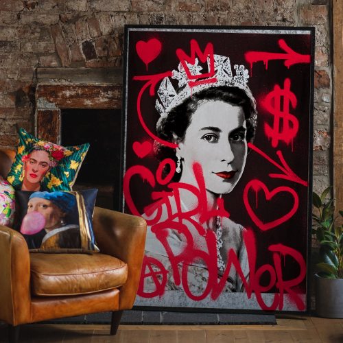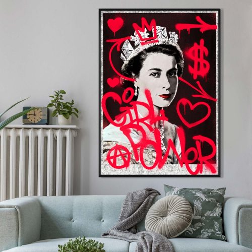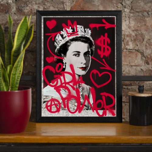 Super cool Urban Art style print depicting Queen Elizabeth in an awesome portrait style, with GIRL POWER and some iconography spray painted over the top.