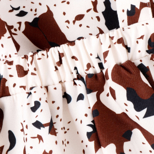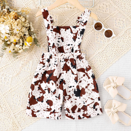 These sleeveless printing short overalls are designed for young girls. They are made of lightweight, breathable polyester fabric for comfort. The overalls have a vibrant, all-over print in bright colors and feature open pockets at the front and back for a more relaxed feel. The wide straps cross over the front of the shoulders for easy adjustments and the leg openings have elastic cuffs for a secure fit. The overalls are perfect for summer days, offering girls fashion and fun in one look.