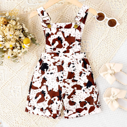 These sleeveless printing short overalls are designed for young girls. They are made of lightweight, breathable polyester fabric for comfort. The overalls have a vibrant, all-over print in bright colors and feature open pockets at the front and back for a more relaxed feel. The wide straps cross over the front of the shoulders for easy adjustments and the leg openings have elastic cuffs for a secure fit. The overalls are perfect for summer days, offering girls fashion and fun in one look.