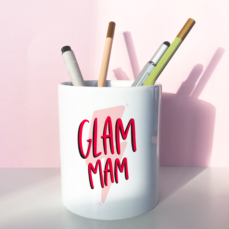 Features the phrase “Glam Mam” in our signature hand-lettered style over a lightning bolt design.