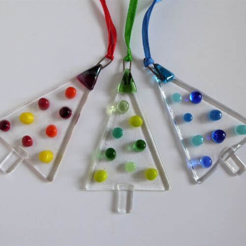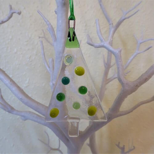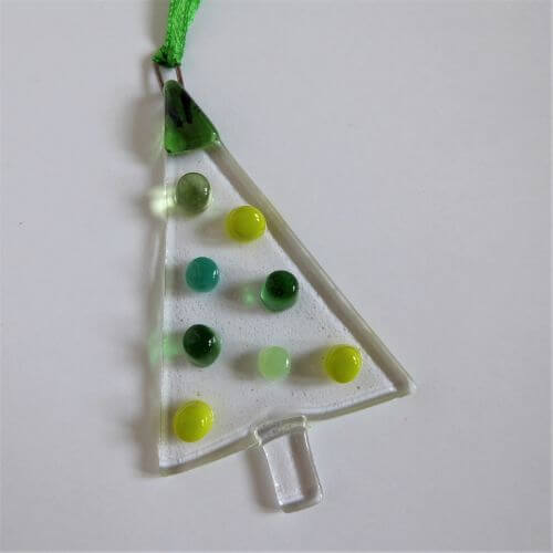 Colourful fused glass Christmas trees in 5 colour schemes and 3 styles. This listing shows Green Bauble Tree.