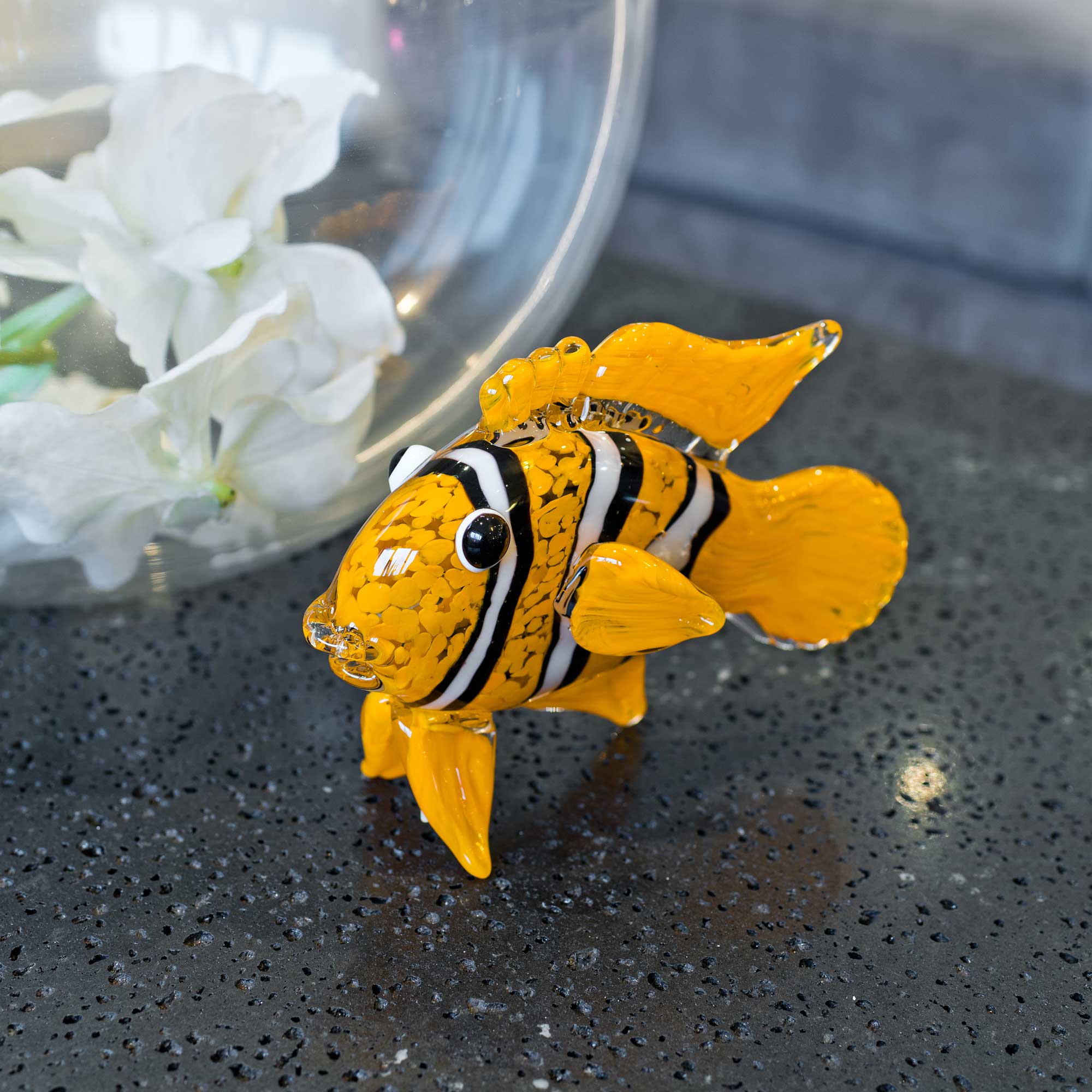 This colourful glass ornament depicts a bright orange clown fish with prominent black and white stripes. The flowing shape and choice of colours are a stunning example of blown glass craftsmanship at its best. Using techniques mastered in Murano Italy, these skilled artisans clearly know how to produce fun, quirky eye-catching gifts designed to put a smile on your face. Part of our Fabulous Glass Animals Collection. Height : 14cmWidth : 10cmDepth : 18.5cm