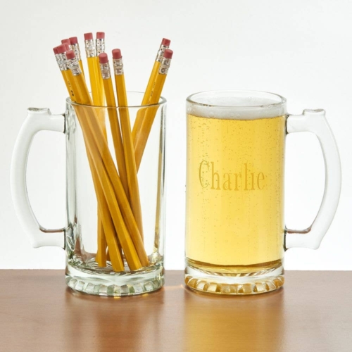 This traditional Pint tankard holds a full 16 ounces and is 6 inches Tall. The handle design is a modified C grip design that extends 1.75 inches from the side of the glass and is 4.5 inches long to accommodate any size hand. The heavy sham base gives it weight and substance. This is a great gift for groomsmen, or FatherÂs Day or any one of numerous commemorable events. Add personalization to make it a truly unique gift. White Gift Box