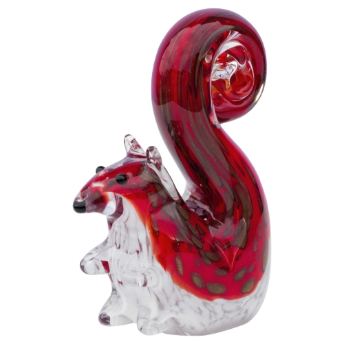 This colourful glass ornament depicts a red and white squirrel with a big curly tail and covered with gold features along the back and tail. The flowing shape and choice of colours are a stunning example of blown glass craftsmanship at its best. Using techniques mastered in Murano Italy, these skilled artisans clearly know how to produce fun, quirky eye-catching gifts designed to put a smile on your face. Part of our Fabulous Glass Animals Collection. Height : 13cm Width : 5cm Depth : 9.5cm