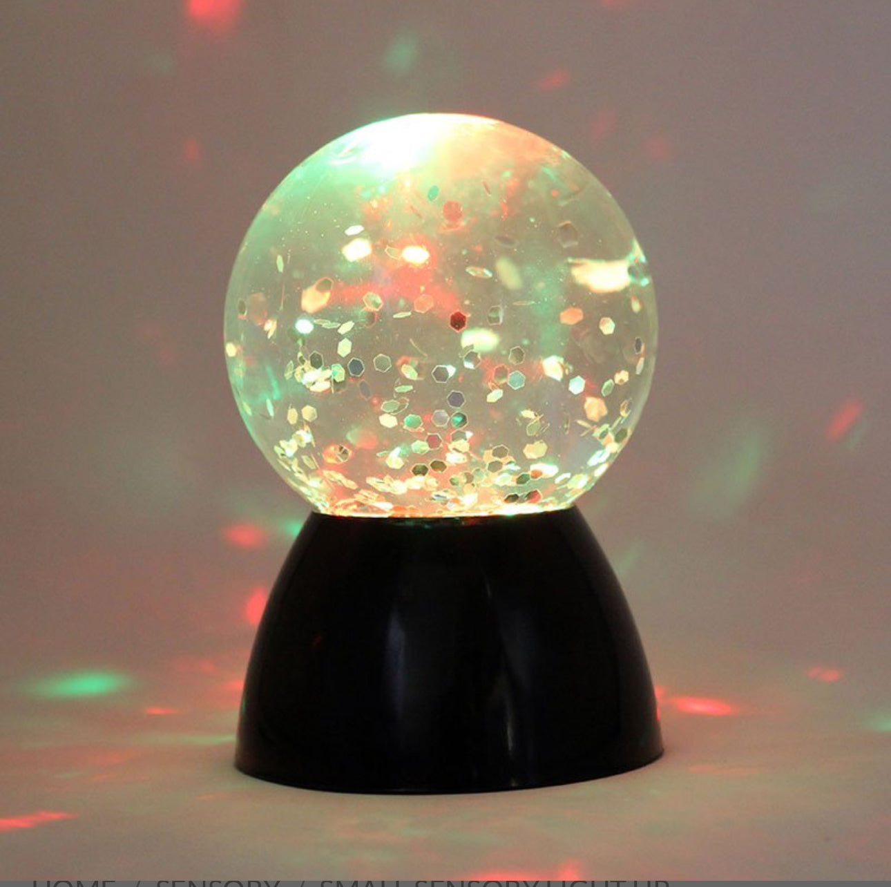 This Glitter ball stands 14cm tall, and contains larger than average hexagon shape glitter for a more impressive look, and is lit up with colour changing LED’s. Features: Size:14cm tall Colour: Base is black. Light is multicoloured PowerSource: Battery Sourced Usage: Sensory or Party