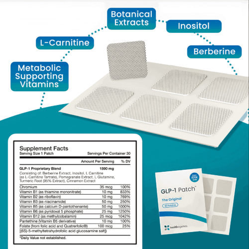 Discover Natural Wellness with the GLP-1 Patch™ Feel the Difference—Choose a Natural Path! Looking for an easier and more natural approach to appetite control, metabolism, and wellness support? The GLP-1 Patch™ offers a modern, science-inspired solution for everyday health. Skip harsh diets and invasive protocols. Embrace the simple, holistic advantages of a small skin patch for effective and gentle wellness support—naturally and effortlessly. 🌱 Vegan and Plant-Based FormulaDesigned for vegans, this formula is based on nutrient-dense botanical extracts. Enjoy an eco-conscious, botanical alternative to drug-based options for your wellness goals. No need to rely on harsh or synthetic interventions. ⏳ Steady and Lasting SupportEach patch uses slow-release delivery for gradual nutrient absorption. Experience round-the-clock support for metabolism and appetite. This means continuous, gentle results—every day, every application. 🔬 Developed by Doctors for Real ResultsFormulated under the guidance of health professionals, this blend energizes you, promotes healthy blood sugar, and supports overall vitality. Get these benefits with no harsh stimulants or artificial additives. 💪 Supports Muscle While Reducing FatThis advanced blend works to burn excess fat while helping you maintain lean muscle, making body composition management more manageable and healthy. 🩺 Holistic Metabolic SupportBoost overall wellness with a formula focused on feeling full, stopping cravings, and balancing blood sugar. Lasting metabolic help is at the core of lasting wellness success. How Does the GLP-1 Patch™ Work? The GLP-1 Patch™ is a contemporary, non-drug method for appetite balance and weight support. Using careful, skin-friendly delivery, each patch provides a doctor-formulated combination right into your system. The technology helps manage hunger, maintain wellness, and improve daily energy—all in a consistent and natural way. Every active part of this patch works with your natural hormone pathways. With routine use, this supports appetite regulation and helps stabilize energy and fullness after eating. The unique blend brings together botanicals and nutrients for lasting effects. You’ll notice improved satisfaction, steadier appetite, and less chance of overeating—all while supporting your health journey. Unlike common prescription solutions or GLP-1 medications that often involve harsh active agents or complex regimens, this patch uses a non-medication formula. That means a gentler, accessible path for those wanting strong results without the downsides. The continuous action supports appetite management, stable metabolism, and energy flow—all seamlessly fitting your lifestyle. Why Make GLP-1 Patch™ Your Choice? Advanced Wellness, Delivered Through an Easy Patch No more pills, complicated supplements, or uncomfortable injections. The GLP-1 Patch™ helps you get nutrients steadily, with a painless and straightforward application—just wear the patch and go about your day. Its advanced blend contains berberine, L-carnitine, and inositol alongside premium plant extracts and essential vitamins for complete support. Weight Management Support—Promote healthier body composition, supporting your goals naturally day by day. Appetite & Craving Control—Reduce temptation, emotional triggers, and mindless snacking habits. Fat Burning & Muscle Support—Target stubborn body fat and preserve lean muscle, all in one. Metabolism & Energy Boost—Enjoy stable energy without reliance on synthetic stimulants or chemicals. Total Cardiometabolic Wellness—Help balance your metabolic profile and maintain steady blood sugars as part of a healthy regimen. The plant-based, skin-forward formula harmonizes every ingredient, providing you comfort and real results for weight and vitality. Seeking a clean alternative to traditional approaches? This flexible, gentle patch fits your lifestyle and wellness goals. Key Ingredients Inside the GLP-1 Patch™ Every GLP-1 Patch™ is engineered with natural wellness in mind, and is fully vegan and cruelty-free. Each patch includes a unique, medication-free formula for steady support: Berberine L-Carnitine Inositol Plant extracts Essential metabolic vitamins This special blend is made for synergy, where each nutrient amplifies the effects of the others. Choosing this patch helps you pursue a more energized, nature-driven way of living and wellness improvement. Want to Boost Your Weight Loss Results? Pair the GLP-1 Patch™ with our Daytime Weight Loss support formula to help boost your results and enhance your wellness journey. Important Details: Not a GLP 1 Agonist or Drug-Based Supplement Produced in a facility certified by cGMP standards, the GLP-1 Patch™ ensures high-quality in every single patch. This wellness tool does not contain synthetic glp 1, nor is it a GLP-1 agonist, nor does it serve as a GLP-1 medication substitute. It is intended for those desiring a gentle, supplemental aid, and is not a replacement for prescribed medication regimens. Consult your healthcare provider before starting any dietary routine, especially if you are on medications or under medical care. Follow the recommended dosage for optimal results and safety. This product is not designed for use by pregnant or breastfeeding women. Not to be used by anyone under the age of 18. *These statements have not been evaluated by the Food and Drug Administration. This product is not intended to diagnose, treat, cure, or prevent any disease.