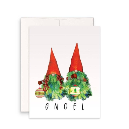 “GNOEL” —A cute Christmas card featuring a garden gnomes couple made of Xmas tree branches and a silly pun!