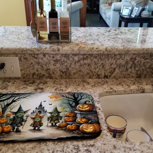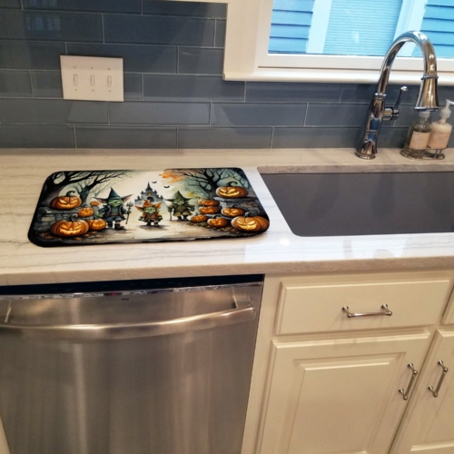 Celebrate Halloween with this Halloween Dish Drying Mat. Say goodbye to messy countertops and soggy dish towels with our innovative dish drying mat. Our high-quality dish drying pad is designed to keep your countertops dry while offering a stylish and efficient solution. Whether you’re air drying dishes, glasses, stemware, silverware, pots, pans, bottles, or even fruits and vegetables, our dish mat is the perfect choice. The 14 inches x 22 inches size fits most counters and dish drying racks, and the non-slip design ensures stability. Made with water-absorbent polyester and a polyurethane foam insert, our dish drying mat is not only functional but also durable. It’s machine washable and printed in the USA for long-lasting use. The beautiful artwork adds flair to your kitchen decor, making it a perfect housewarming gift or present for any occasion. Upgrade your kitchen experience with our absorbent and versatile dish drying mat.