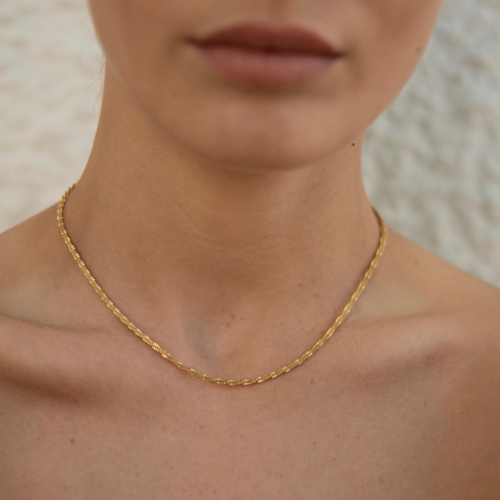 Dainty and minimal gold choker necklace. This classy and timeless necklace can complete any outfit. The necklace length is adjustable for more versatile wear. Composition 18K gold layer over stainless steel base. We found the perfect formula to create gold plated jewellery that is durable, doesn’t discolour and looks just as good as fine jewellery. We use PVD technique for the gold coating over a stainless steel base. Our pieces are coated in a thicker gold plating than the industry standard for anti-tarnish, waterproof and long lasting wear.Due to the hypoallergenic properties of the stainless steel, it is unlikely that the jewellery will cause an allergic reaction. Our pieces are nickel free. Size Total length: 16″/42cm with, with extension from 14″/37cm to 2″/5cm. Width: 2mm. Shipping FREE UK Standard shipping. Option to upgrade to 24hs/48hs Tracked delivery at the checkout. Packaging All of our jewellery comes in a Briella card inside a large and delicate white linen pouch, perfect for gifting.