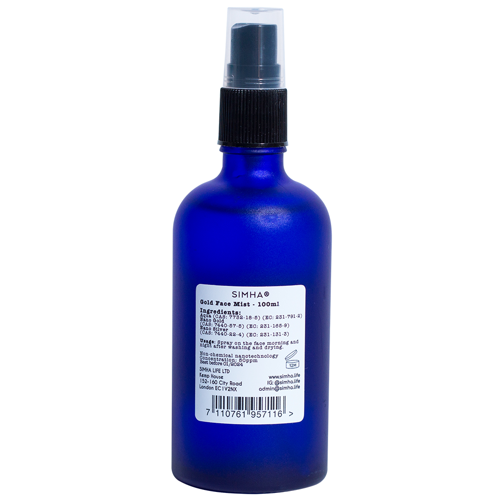 SIMHA Gold Face Mist contains essential vitamins and minerals found in Gold to stimulate the cells and ions of the skin, this helps rejuvenate the cells keeping the skin nourished and hydrated.