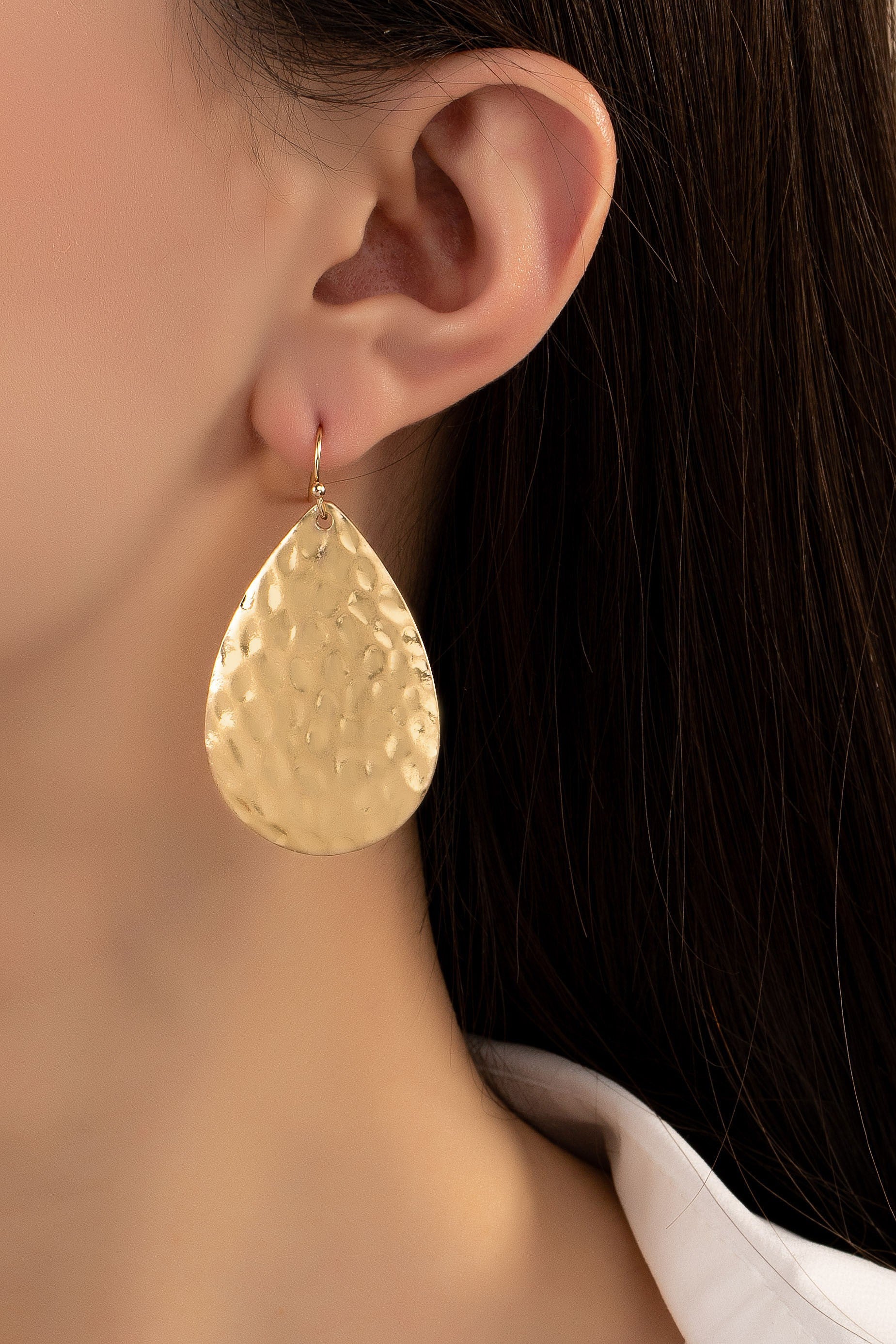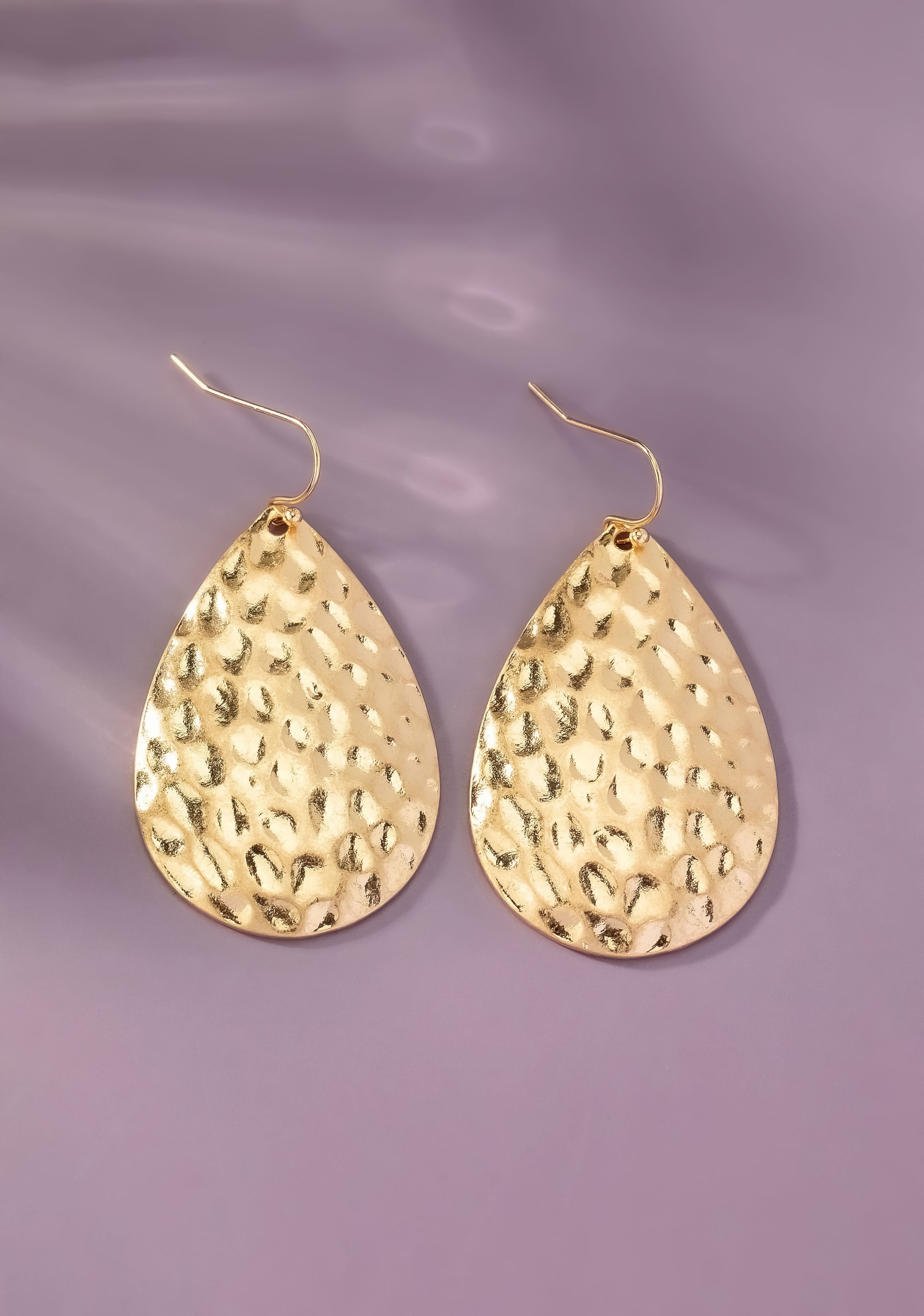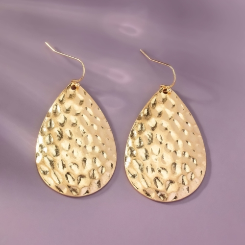 Add a touch of sophistication with these gold hammered teardrop metal earrings. Featuring a sleek teardrop shape with a hammered texture, these earrings offer a modern and elegant look that complements any outfit. product details1.25″ x 2.25″FishhookAlloyWorn gold plating