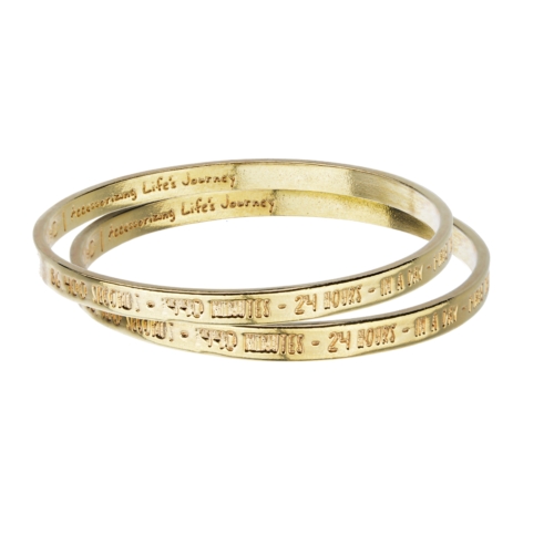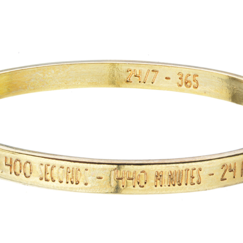 86,400 Seconds – 1440 Minutes – 24 Hours – In a day – Make them count! inscribed on the outside. 24/7 365 inscribed on the inside. Full Circle Bangles from WHD. Gold Plated. Made in USA. 18KPG