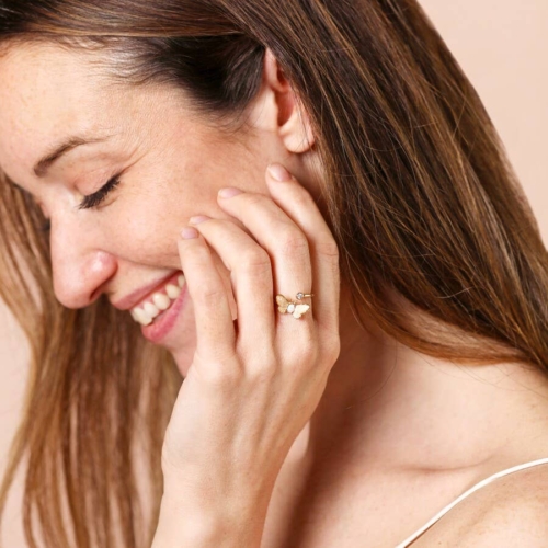 An adjustable open ring in gold platingFeaturing a clear crystal on one sideComplete with a large opal butterflyPerfect for children’s jewellery collectionsDimensions: adjustable butterfly width 20mm x height 5mmUK ring sizeMade from: opal, 14ct gold plated brass