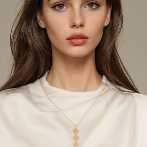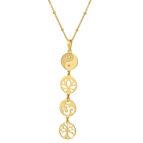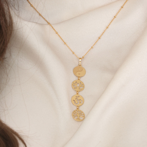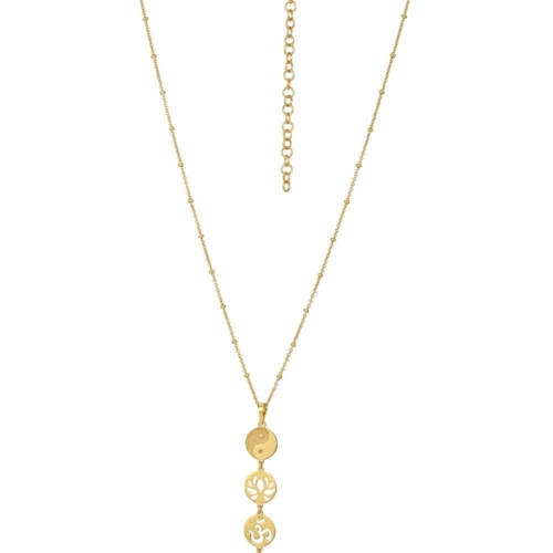 Four small discs with powerful symbols come together in powerful link necklace: draw strength from each to inspire a life of tranquility and connection. The symbols include the Yin Yang, the Lotus flower, the Om symbol, and the Tree of Life. Each pendant is a total of 2.5 inches long (bail included in measurements) and 0.45 inches wide. The beaded chain is 16″+3″ longSymbols and meanings are as follows:Yin Yang – BalanceLotus – PerseveranceOm – Divine WisdomTree of Life – Interconnectedness* Link necklace with spiritual symbols* Features four symbols* Made of 18k gold plated brass* Each disc is about 0.45″ in diameter* The overall length of the pendant is about 2.5 inches* The chain measures 16″+3″