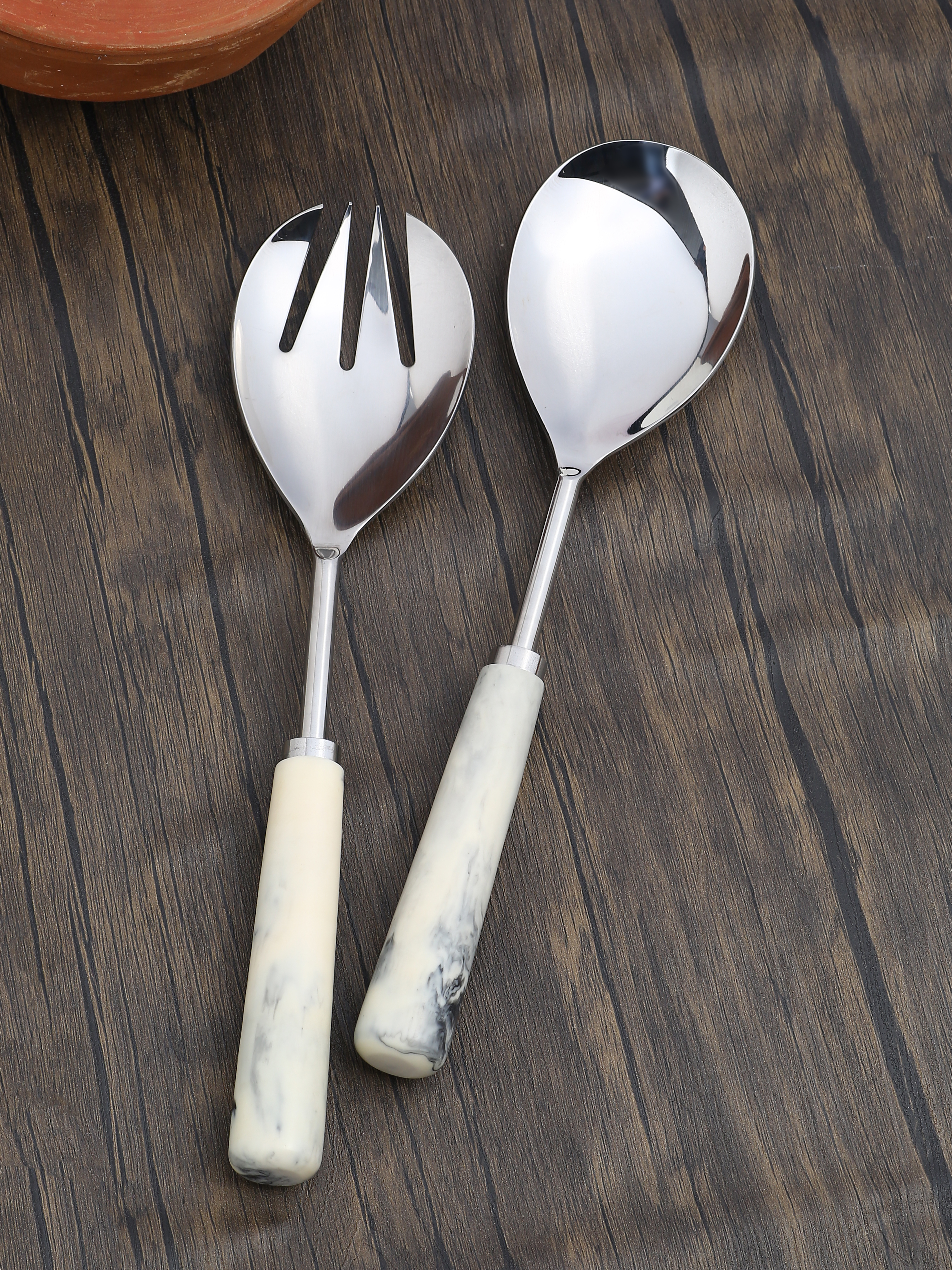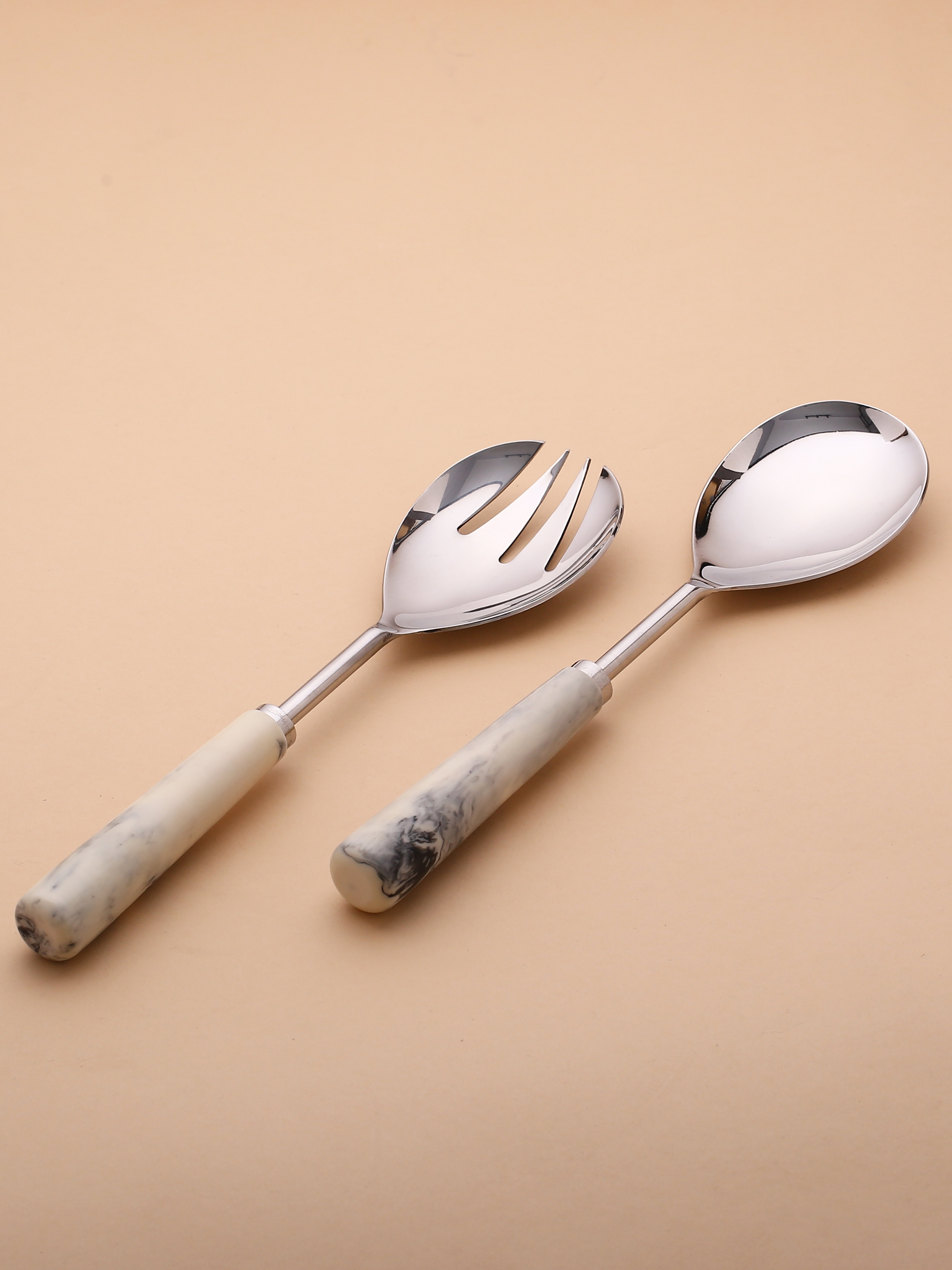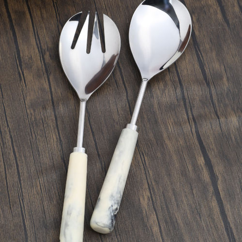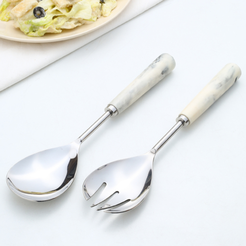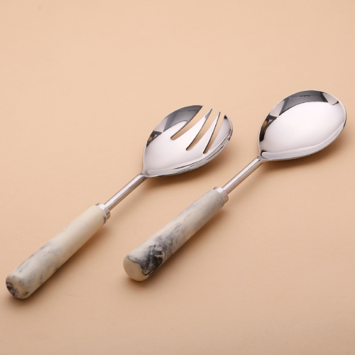 Dress your table at dinner parties with these striking handcrafted salad servers. Contemporary in design, their marble look-a-like resin handles feature unique markings throughout. Darkened, brushed metal gives these essential kitchen accessories a stylish and modern look. Care Instructions- Hand wash only