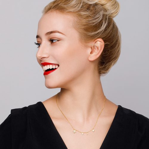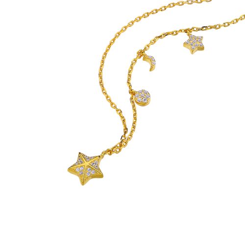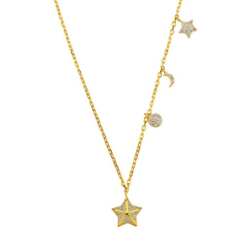 Inspired by the night sky this necklace is a perfect match for both casual and formal occasions. The asymmetric design of astronomical objects hinged on one side of a loose chain adds a fun vibe to otherwise timeless design. Crafted from gold-tone sterling silver encrusted with cubic zirconias, it will compliment any outfit from loose tops to slip dresses. Perfect for Stacking.