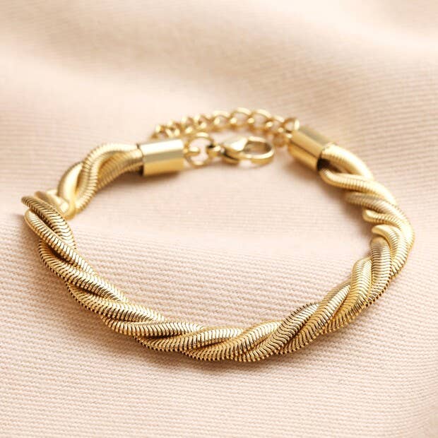 Made up of three snake chains linked together, these chains twist and turn in the light to create a slinky, vintage feel.Fasten it using the lobster clasp and adjust it with the extender chain to find the size that suits best.Dimensionsinner circumference – 16.5cm with a 3cm extender chainMade from14ct gold plated stainless steel