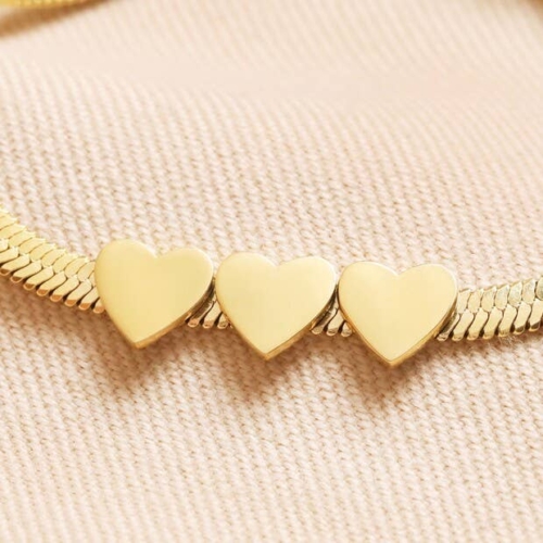 Made of stainless steel plated in shining 14ct gold, the sleek, flat herringbone chain is decorated with three shiny heart charms affixed side by side. The bracelet fastens simply via a lobster clasp and can be adjusted using the extender chain. Dimensionsinner circumference – 15.9cm with 3cm extendercharms – width 6mmMade from14ct gold plated stainless steel