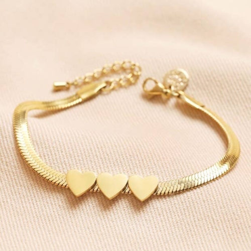 Made of stainless steel plated in shining 14ct gold, the sleek, flat herringbone chain is decorated with three shiny heart charms affixed side by side. The bracelet fastens simply via a lobster clasp and can be adjusted using the extender chain. Dimensionsinner circumference – 15.9cm with 3cm extendercharms – width 6mmMade from14ct gold plated stainless steel