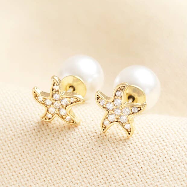 Made of 14ct gold plated brass, each starfish is adorned with shimmering cubic zirconia stones, creating a beautiful sparkle. The earrings are completed with large, elegant pearl backs that add a sophisticated touch. Dimensionswidth 0.7cm x height 0.7cm x depth 1.4cmMade from14ct gold plated brass, pearl