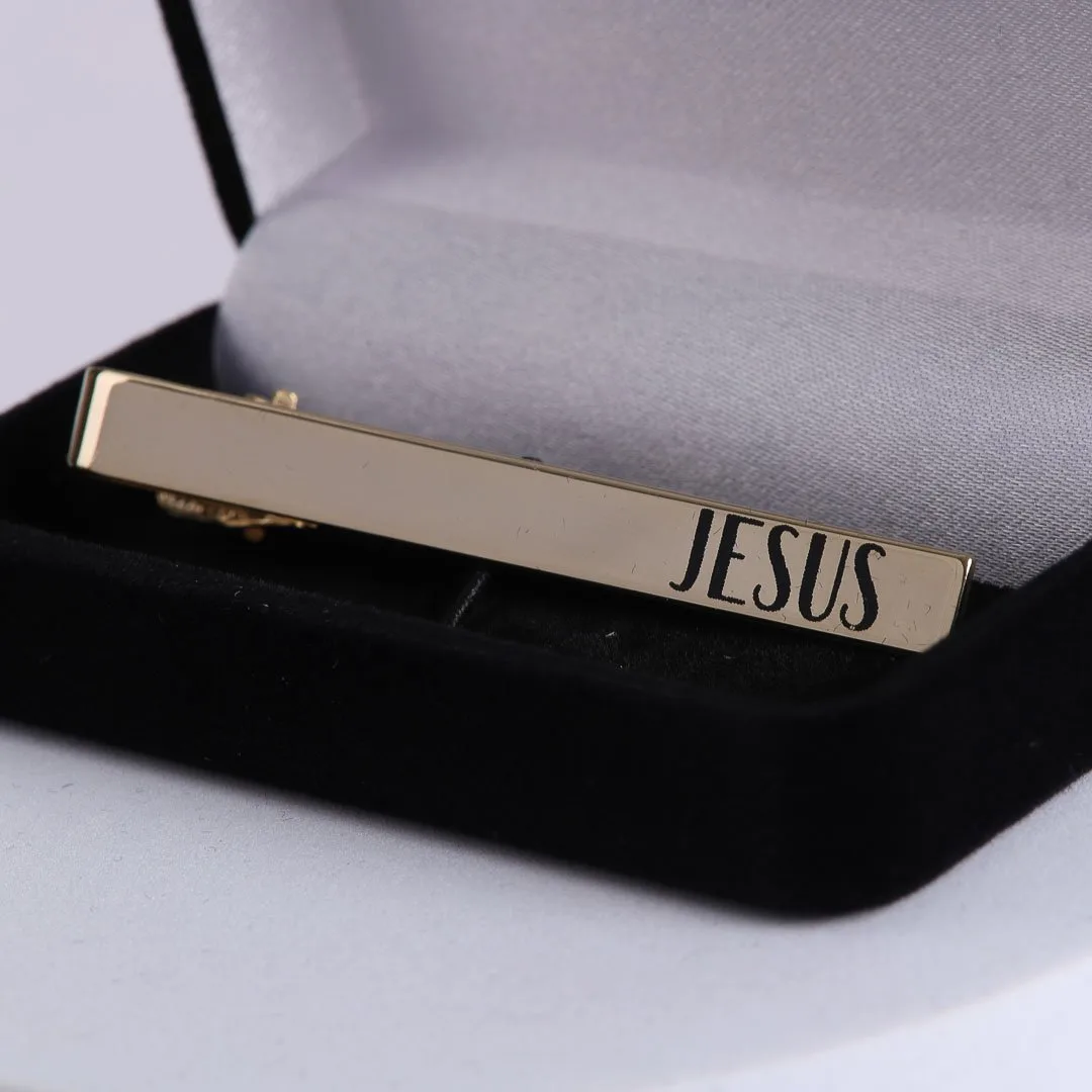 This Elegant Goldtone Tie Bar is the perfect accessory for those who want to subtly showcase their faith in a stylish and meaningful way. The tie bar features the name of Jesus in a beautifully crafted decorative serif font, printed and baked onto a reflective gold base. The goldtone finish gives the tie bar a sleek and polished look that shines with elegance, making it ideal for both daily wear and special occasions.