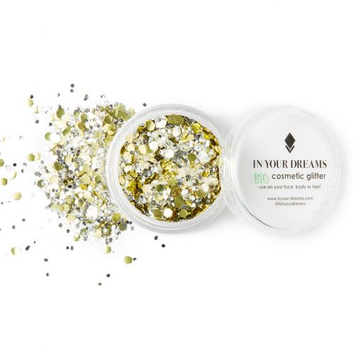 Golden Mirage biodegradable glitter is a multi-dimensional mix of gold, silver and sandy tones and is safe to use on your face, body, nails and hair!