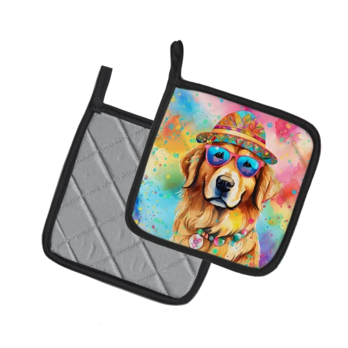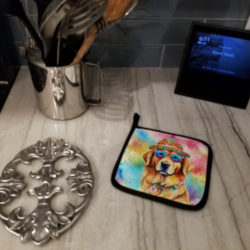 Pair of Pot Holders featuring breed specific Golden Retriever artwork. A Pair of Pot Holders to match your kitchen decor. Made in the USA these are thick and functional. Full color artwork decorates the front polyester fabric of the hot pad and accented by a black trim. Use these at as a trivet for your Thanksgiving or Christmas tablescape. Filled with insulated fabric and quilted for durability. These colorful pot holders will make a great gift for your favorite home cook or executive chef. Each pot holder measures approximately 7 1/2 inches by 7 1/2 inches. A hanging tab is included.