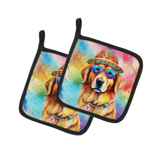 Pair of Pot Holders featuring breed specific Golden Retriever artwork. A Pair of Pot Holders to match your kitchen decor. Made in the USA these are thick and functional. Full color artwork decorates the front polyester fabric of the hot pad and accented by a black trim. Use these at as a trivet for your Thanksgiving or Christmas tablescape. Filled with insulated fabric and quilted for durability. These colorful pot holders will make a great gift for your favorite home cook or executive chef. Each pot holder measures approximately 7 1/2 inches by 7 1/2 inches. A hanging tab is included.