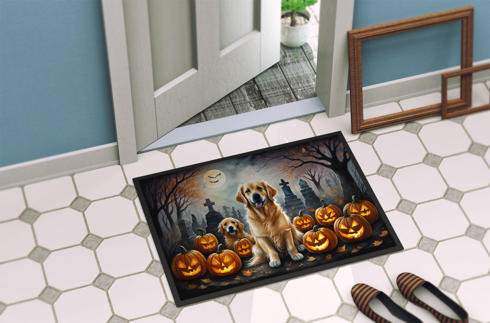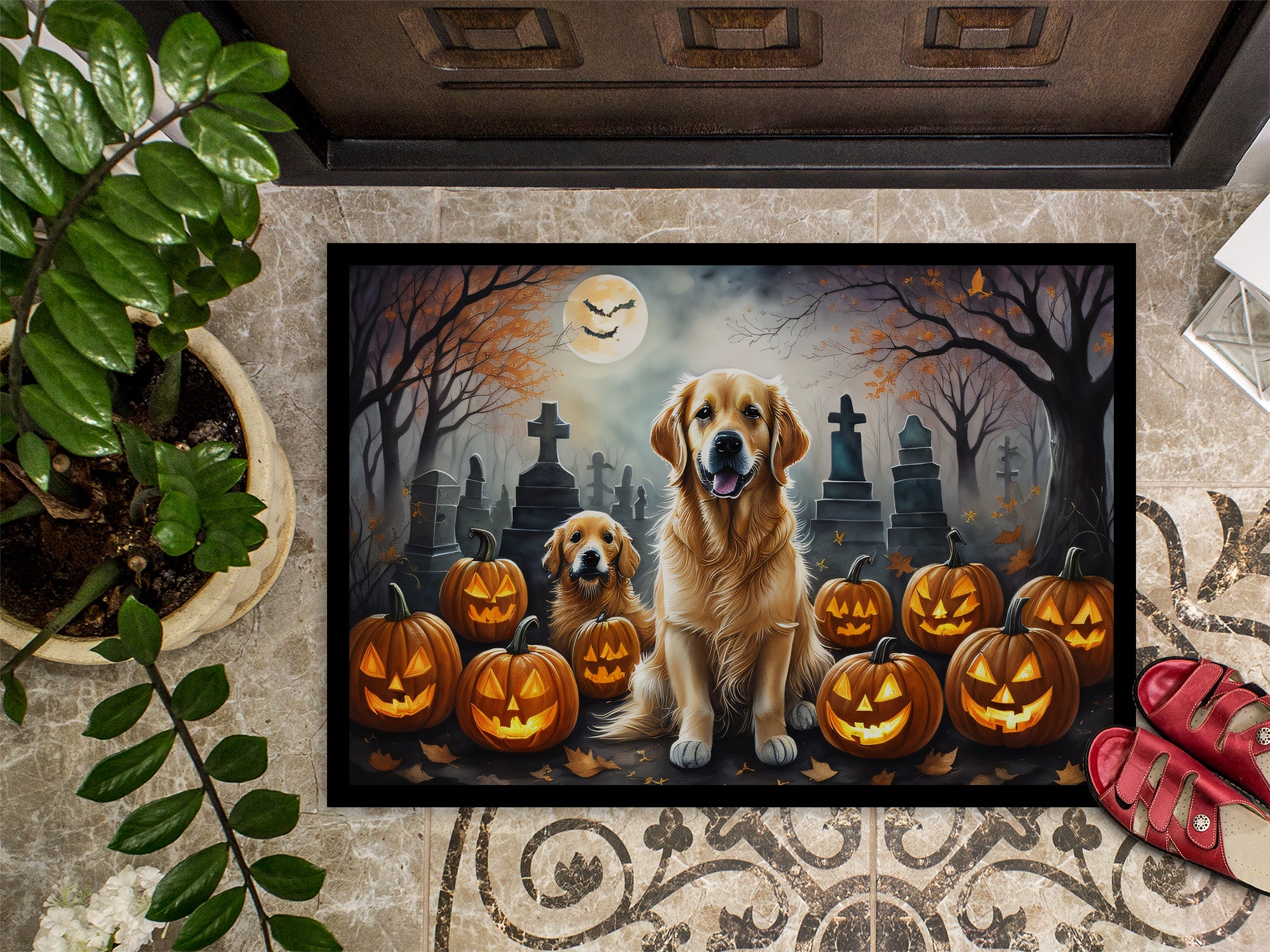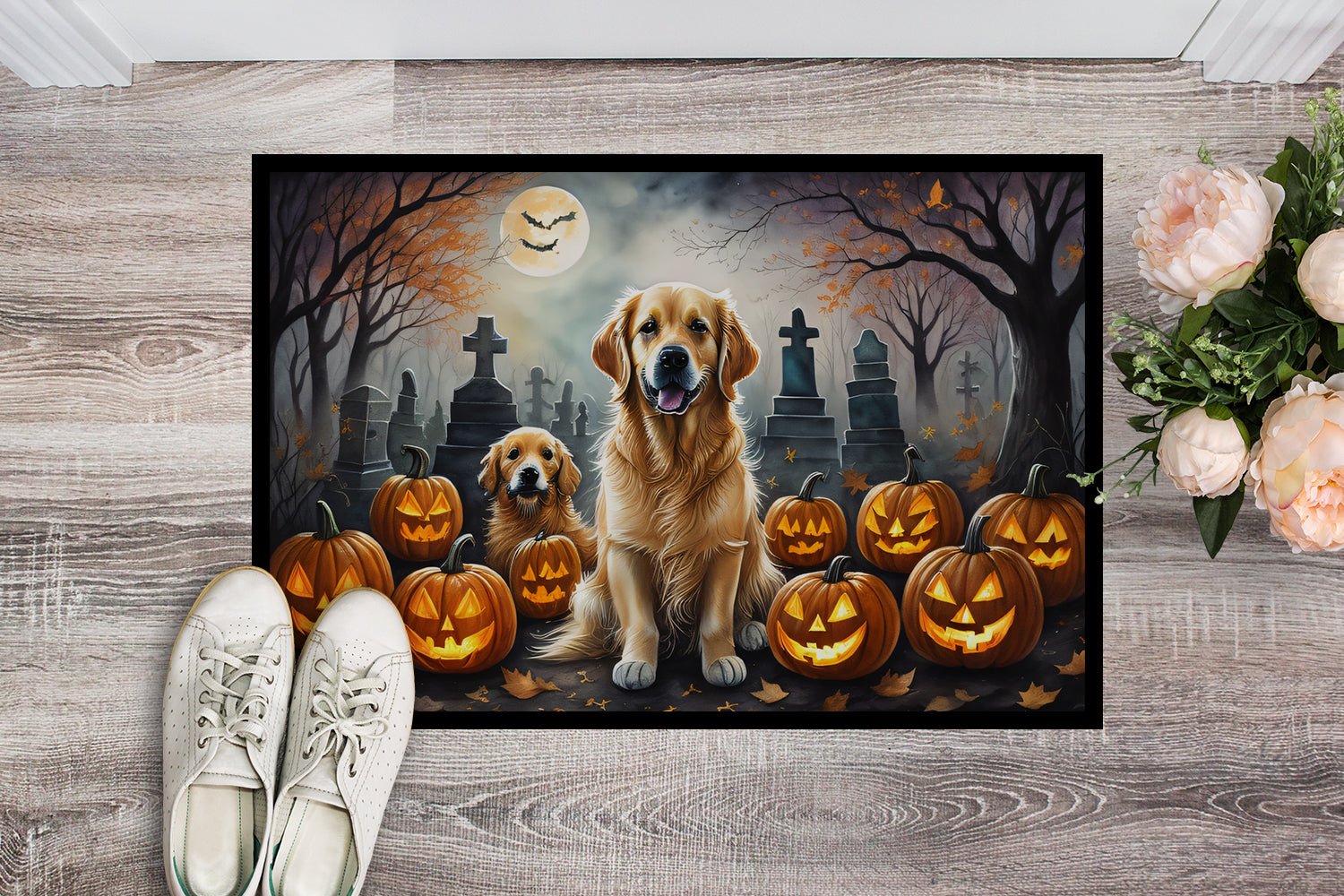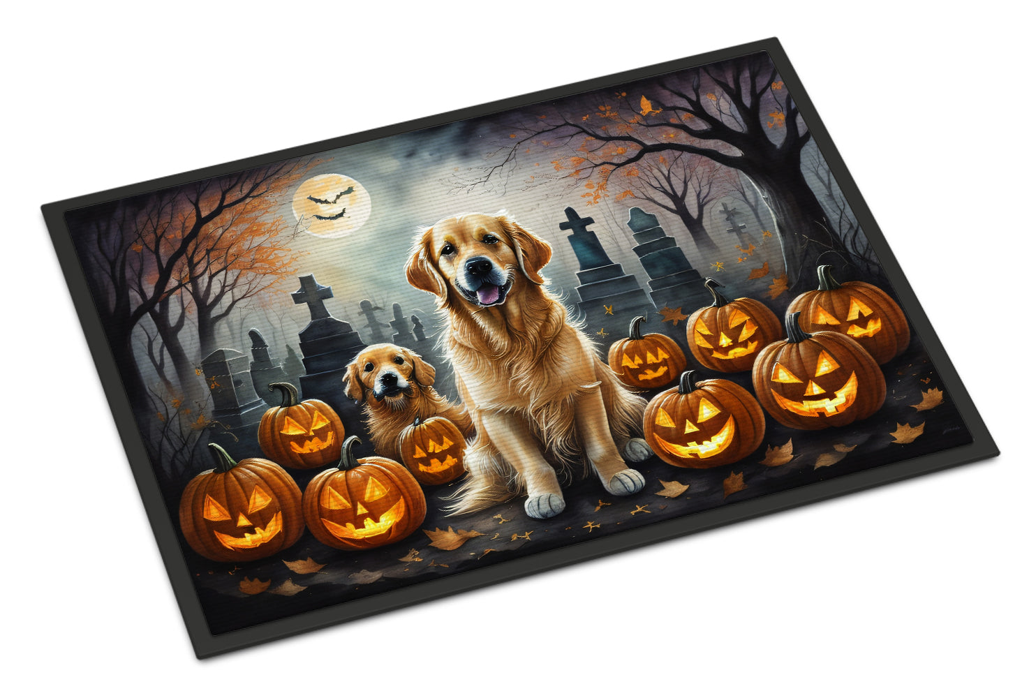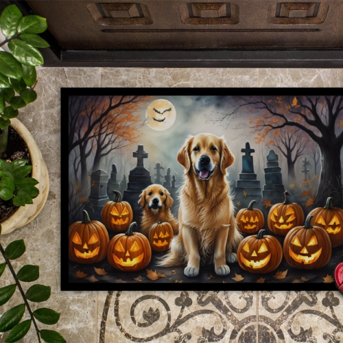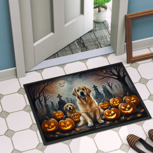 Doormat featuring breed specific Golden Retriever artwork. Celebrate Halloween with this Halloween Doormat. Welcome your guests in style with our Artwork Door Mat, designed to withstand almost any weather condition. This mat, measuring approximately 18 by 27 inches, is held together by durable black binding tape. Its top layer, composed of polyester felt, is dyed with the eye-catching image you see on the mat. A few layers below provide the mat with stability, while its rubber bottom is stamped to help prevent slipping and ensures safety. Our mat works wonderfully as both an indoor or outdoor door mat. For cleaning, simply hose it off with water or use a power washer – no need for any cleaner that produces suds. Avoid scrubbing with a brush, instead, opt for the vacuum on floor setting. Designed manufactured and printed in the USA, this mat is a perfect addition to your porch, outdoor kitchen, entryway, or any indoor space. Its unique design makes it a charming decorative rug that greets your guests and adds a stylish touch to your home decor.