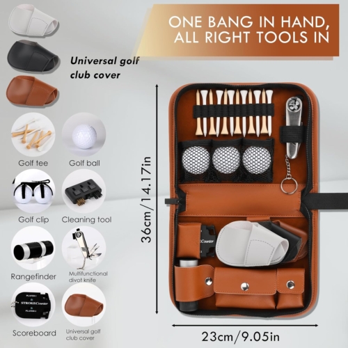 【Useful Various Kit】 The accessories come in a high-grade handbag (9.07 x 7.09 inches), which is portable and includes Golf Balls, Rangefinder, Brush, Golf Tees, Multifunctional Divot Knife, Golf Ball Clamp, Mini Scorer, Golf Club Cover.