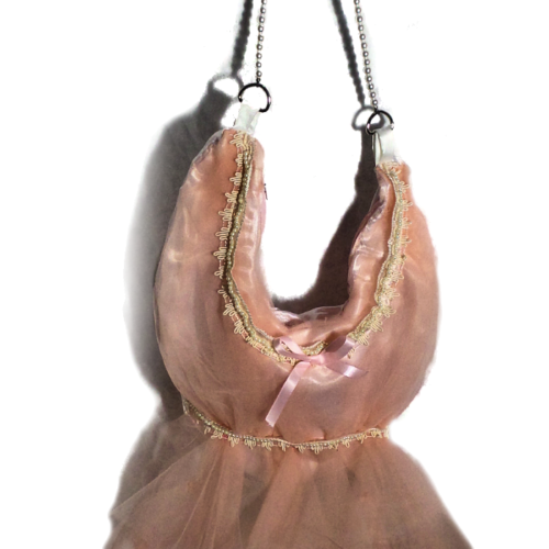 Netflix and chill come to life with this lace trimmed night gown hobo bag! Pearl trim around “neckline” and waist adds it a trompe l’oeil look. Neckline accented with a pink box.