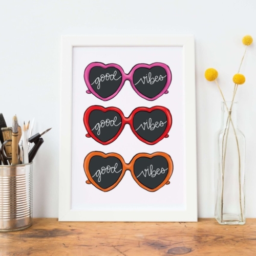 Good Vibes Sunglasses Art Print – Spread Positivity in Style Brighten your space with this cheerful Good Vibes Sunglasses art print! Featuring colourful sunglasses adorned with hand-illustrated “good vibes,” this print is perfect for your home office, girls’ bedroom, or anywhere you want to spread positivity. Frame not included; this listing is for the print only. Size: A4 (210 × 297mm or 8.27 × 11.69”) – a fantastic home décor idea for any space that needs a touch of good vibes. Material: Printed on premium eco-friendly 350gsm FSC-certified cardstock. Packaging: Shipped carefully in a clear protective cello sleeve and packed into a sturdy card-backed mailer envelope to ensure safe worldwide delivery. Made in Dublin, Ireland.