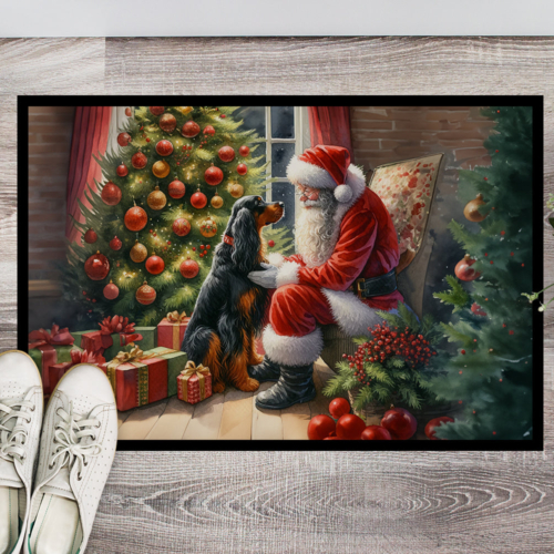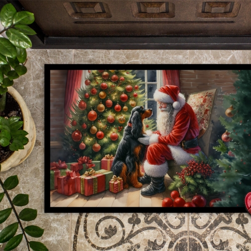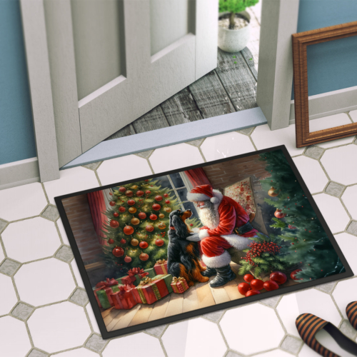 Doormat featuring breed specific Gordon Setter artwork. Celebrate Christmas with this Christmas Doormat. Welcome your guests in style with our Artwork Door Mat, designed to withstand almost any weather condition. This mat, measuring approximately 18 by 27 inches, is held together by durable black binding tape. Its top layer, composed of polyester felt, is dyed with the eye-catching image you see on the mat. A few layers below provide the mat with stability, while its rubber bottom is stamped to help prevent slipping and ensures safety. Our mat works wonderfully as both an indoor or outdoor door mat. For cleaning, simply hose it off with water or use a power washer – no need for any cleaner that produces suds. Avoid scrubbing with a brush, instead, opt for the vacuum on floor setting. Designed manufactured and printed in the USA, this mat is a perfect addition to your porch, outdoor kitchen, entryway, or any indoor space. Its unique design makes it a charming decorative rug that greets your guests and adds a stylish touch to your home decor.