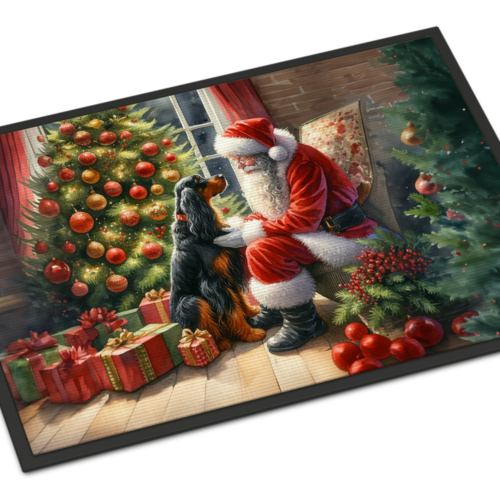 Doormat featuring breed specific Gordon Setter artwork. Celebrate Christmas with this Christmas Doormat. Welcome your guests in style with our Artwork Door Mat, designed to withstand almost any weather condition. This mat, measuring approximately 18 by 27 inches, is held together by durable black binding tape. Its top layer, composed of polyester felt, is dyed with the eye-catching image you see on the mat. A few layers below provide the mat with stability, while its rubber bottom is stamped to help prevent slipping and ensures safety. Our mat works wonderfully as both an indoor or outdoor door mat. For cleaning, simply hose it off with water or use a power washer – no need for any cleaner that produces suds. Avoid scrubbing with a brush, instead, opt for the vacuum on floor setting. Designed manufactured and printed in the USA, this mat is a perfect addition to your porch, outdoor kitchen, entryway, or any indoor space. Its unique design makes it a charming decorative rug that greets your guests and adds a stylish touch to your home decor.