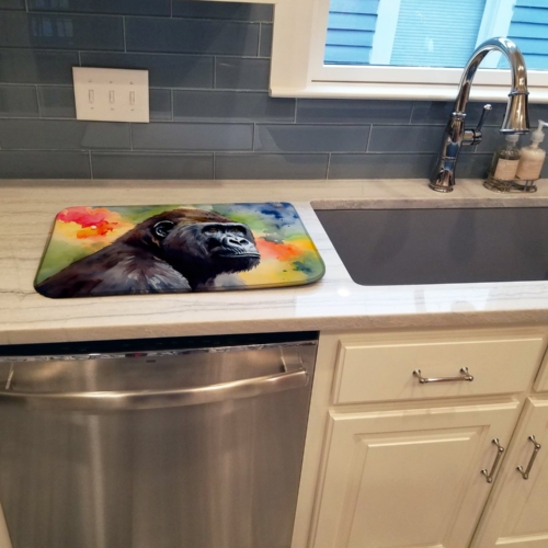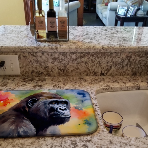 Dish Drying Mat featuring breed specific Gorilla artwork. Say goodbye to messy countertops and soggy dish towels with our innovative dish drying mat. Our high-quality dish drying pad is designed to keep your countertops dry while offering a stylish and efficient solution. Whether you’re air drying dishes, glasses, stemware, silverware, pots, pans, bottles, or even fruits and vegetables, our dish mat is the perfect choice. The 14 inches x 22 inches size fits most counters and dish drying racks, and the non-slip design ensures stability. Made with water-absorbent polyester and a polyurethane foam insert, our dish drying mat is not only functional but also durable. It’s machine washable and printed in the USA for long-lasting use. The beautiful artwork adds flair to your kitchen decor, making it a perfect housewarming gift or present for any occasion. Upgrade your kitchen experience with our absorbent and versatile dish drying mat.