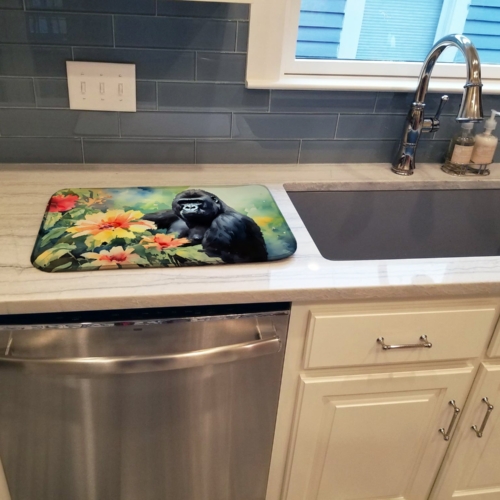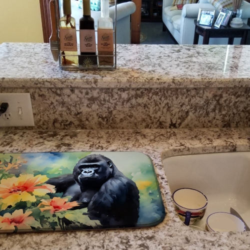Dish Drying Mat featuring breed specific Gorilla artwork. Say goodbye to messy countertops and soggy dish towels with our innovative dish drying mat. Our high-quality dish drying pad is designed to keep your countertops dry while offering a stylish and efficient solution. Whether you’re air drying dishes, glasses, stemware, silverware, pots, pans, bottles, or even fruits and vegetables, our dish mat is the perfect choice. The 14 inches x 22 inches size fits most counters and dish drying racks, and the non-slip design ensures stability. Made with water-absorbent polyester and a polyurethane foam insert, our dish drying mat is not only functional but also durable. It’s machine washable and printed in the USA for long-lasting use. The beautiful artwork adds flair to your kitchen decor, making it a perfect housewarming gift or present for any occasion. Upgrade your kitchen experience with our absorbent and versatile dish drying mat.