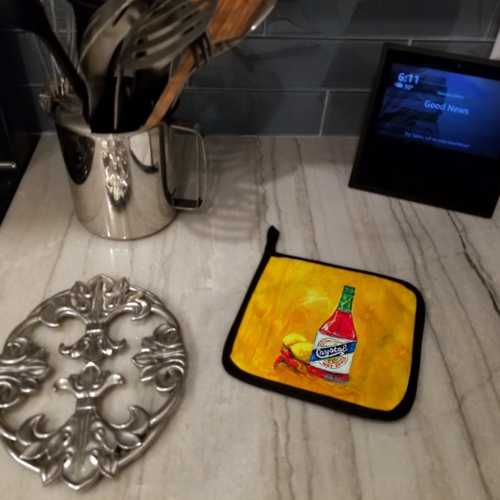 A Pair of Pot Holders to match your kitchen decor. Made in the USA these are thick and functional. Full color artwork decorates the front polyester fabric of the hot pad and accented by a black trim. Use these at as a trivet for your Thanksgiving or Christmas tablescape. Filled with insulated fabric and quilted for durability. These colorful pot holders will make a great gift for your favorite home cook or executive chef. Each pot holder measures approximately 7 1/2 inches by 7 1/2 inches. A hanging tab is included.